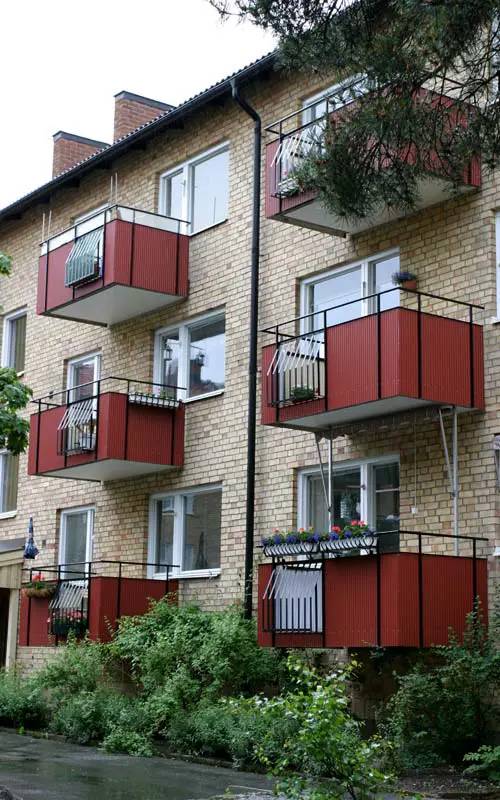 Detta balkongräcke bekläds med sinusprofilerad aluminiumplåt i kombination med utvändiga dekorstolpar. Detta räcke är tidstypiskt vilket gör att det lämpar sig väl för varsamma renoveringar av äldre fastigheter.